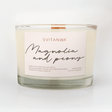 Ароматична свічка із натурального соєвого воску "Магнолія та півонія" має ніжний, повітряний і витончений аромат, що поєднує свіжі квіти, краплю зелені та м’який пудровий шлейф.